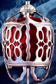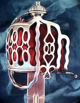 This flamboyant hot forged steel hilt is based on one of the more elaborate and ornate hilts from the second quarter of the 18th Century. The solid oak grip has steel ferrules and is wrapped in blue-grey rayskin with spiral copper wire bindings. A leather liner covered either side with thick red cloth adorns the inside of the hilt. The liner helps to prevent chaffing and also gives protection to the users hand. The diamond section, double fullered blade has a full tang and is made from silicon manganese spring steel that is hardened and tempered to 52-54 Rockwell C.