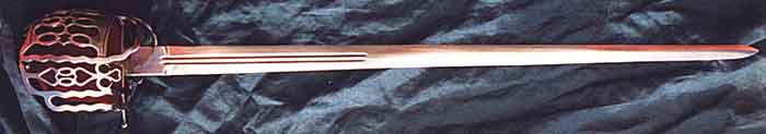 This flamboyant hot forged steel hilt is based on one of the more elaborate and ornate hilts from the second quarter of the 18th Century. The solid oak grip has steel ferrules and is wrapped in blue-grey rayskin with spiral copper wire bindings. A leather liner covered either side with thick red cloth adorns the inside of the hilt. The liner helps to prevent chaffing and also gives protection to the users hand. The diamond section, double fullered blade has a full tang and is made from silicon manganese spring steel that is hardened and tempered to 52-54 Rockwell C.